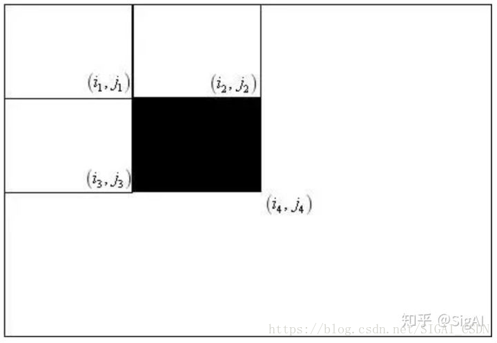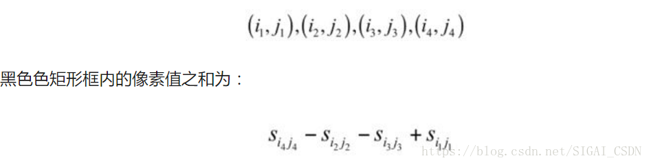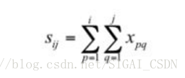 为了实现快速计算,使用了一种称为积分图(Integral Image)的机制。通过积分图可以快速计算出图像中任何一个矩形区域的像素之和,从而计算出各种类型的Haar-like特征。假设有一张图像,其第i行第j列处的像素值为,积分图定义为: