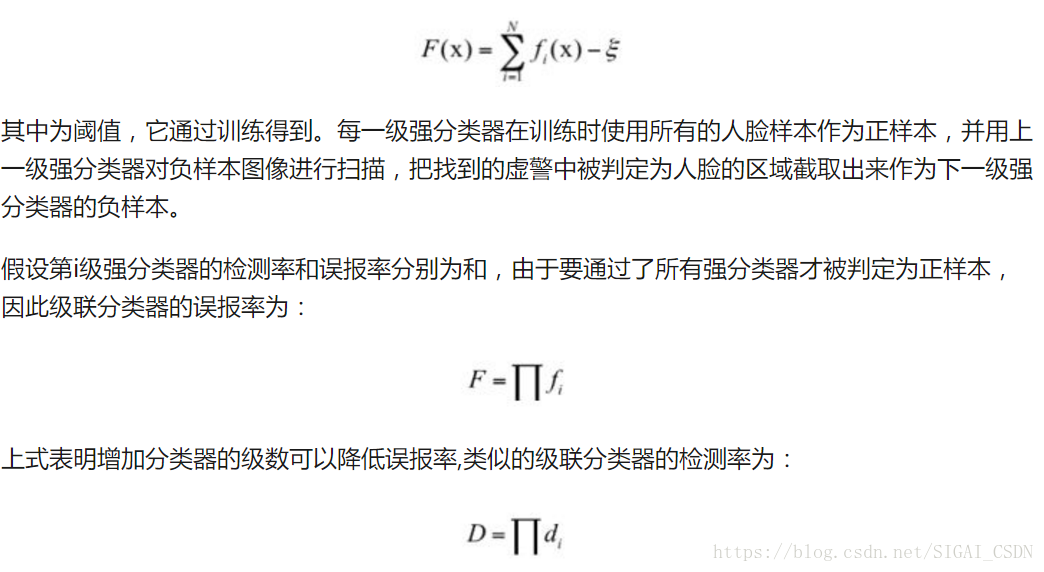 这个式子表明增加分类器的级数会降低检测率。对于前者,可以理解为一个负样本被每一级分类器都判定为正样本的概率;对于后者,可以理解为一个正样本被所有分类器都判定为正样本的概率。