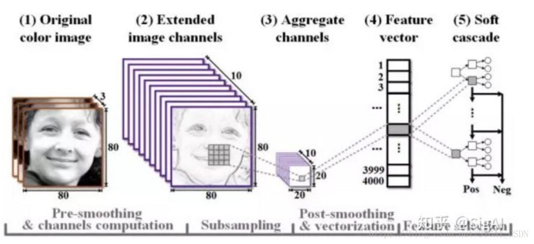 ACF[15](Aggregate ChannelFeatures for Multi-view Face Detection)是一种为分类提供足够多的特征选择的方法。在对原图进行处理后,得到多通道的图像,这些通道可以是RGB的通道,可以是平滑滤波得到的,可以是x方向y方向的梯度图等等。将这些通道合起来,在此基础上提取特征向量后续采用Soft-Cascade分类器进行分类。