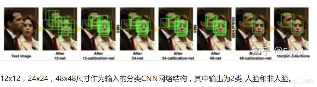 构建多尺度的人脸图像金字塔,12-net将密集的扫描这整幅图像(不同的尺寸),快速的剔除掉超过90%的检测窗口,剩下来的检测窗口送入12-calibration-net调整它的尺寸和位置,让它更接近潜在的人脸图像的附近。