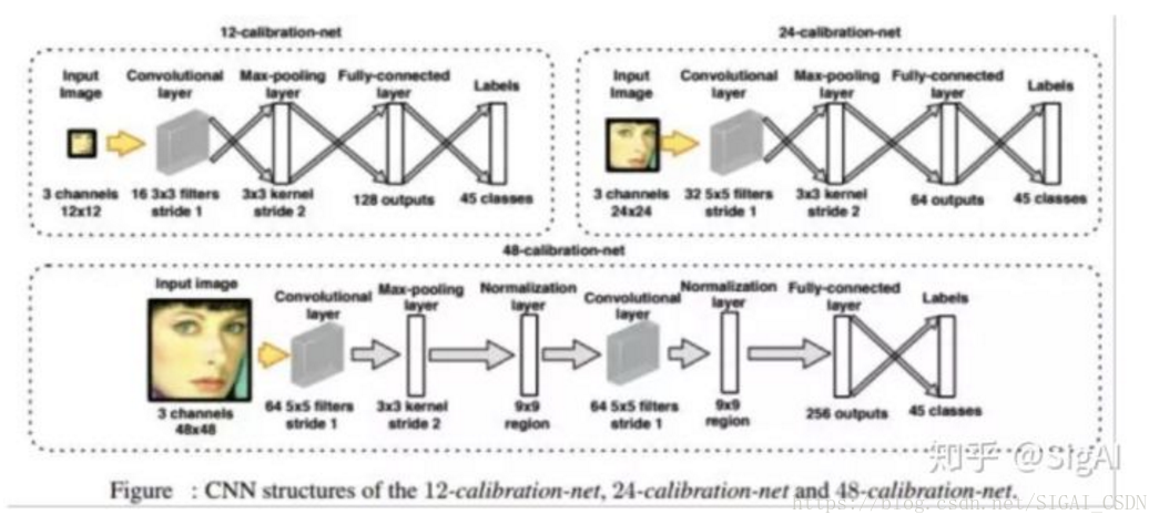 12x12,24x24,48x48尺寸作为输入的矫正(calibration)CNN网络结构。其中输出为45中种矫正模式的类别。
