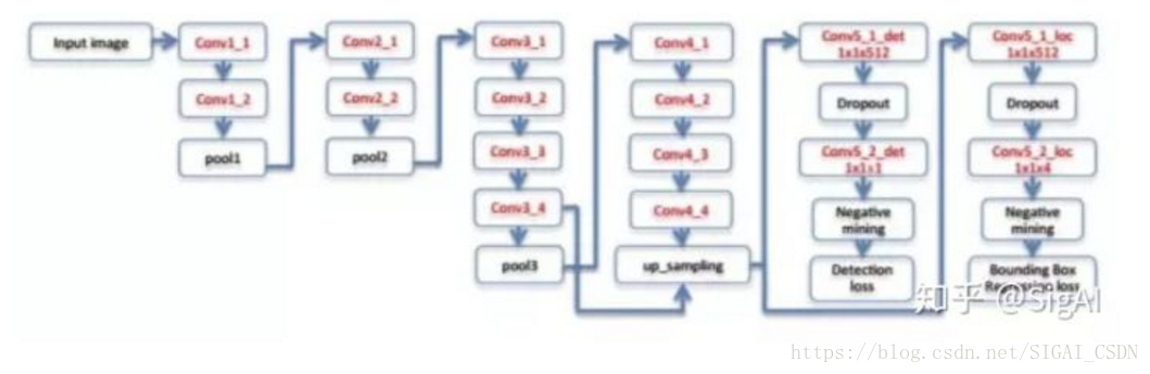 backbone从VGG 19网络改进得到,包含16个卷积层。前12个卷积层用VGG 19的模型进行初始化。卷积层conv4_4的的输出被送入4个 的卷积层中。第一组的两个卷积层产生1通道的输出图像作为置信度得分;第二组的两个卷积层产生4通道的输出图像作为矩形框的4个坐标。网络的输出有两个并列的分支,分别表示置信度和矩形框位置预测值。整个网络的结构如下图所示: