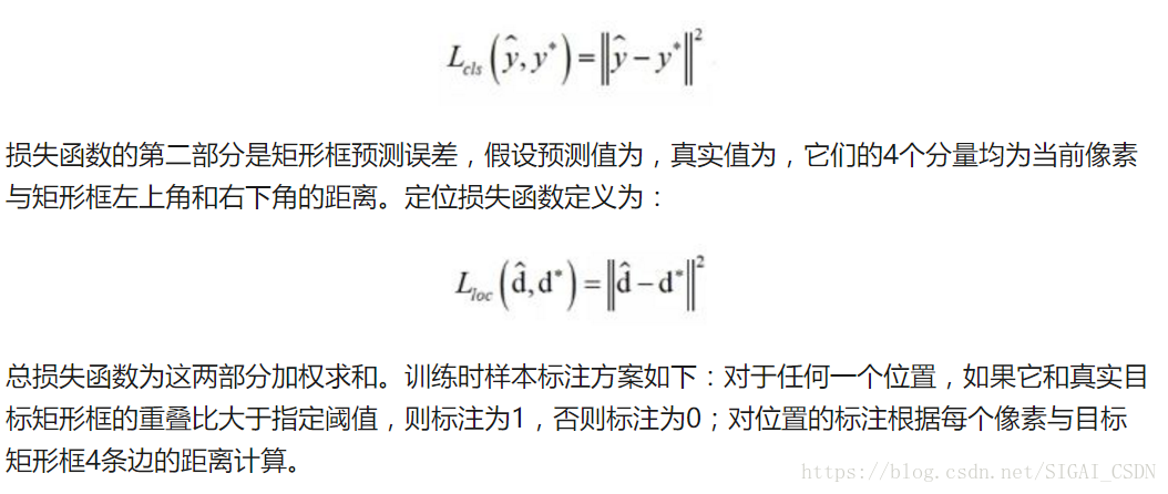 由于输出层有两个并列分支,损失函数由两部分组成。第一部分输出值为分类置信度即本位置是一个目标的概率,用表示。真实的类别标签值为,取值为0或者1,分别表示是背景和目标。分类损失函数定义为: