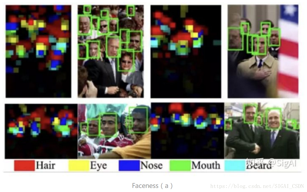 根据attribute-aware深度网络生成人脸部件map图(partness map),如上图Faceness(a)中的颜色图,文章共使用了5个部件:hair,eye,nose,mouth,beard. 通过part的结合计算人脸的score.部件与部件之间是有相对位置关系的,比如头发在眼睛上方,嘴巴在鼻子下方,因此利用部件的spatial arrangement可以计算face likeliness. 通过这个打分对原始的人脸proposal进行重排序. 如图Faceness(b)。