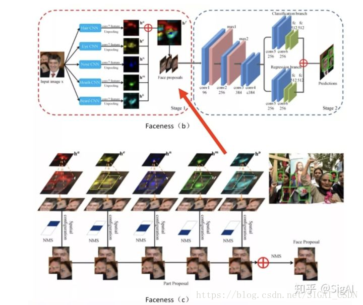 Faceness-Net[19]是一个典型的由粗到精的工作流,借助了多个基于DCNN网络的facial parts分类器对人脸进行打分,然后根据每个部件的得分进行规则分析得到Proposal的人脸区域,最后通过一个Refine的网络得到最终的人脸检测结果。整体流程如图 Faceness(b)。