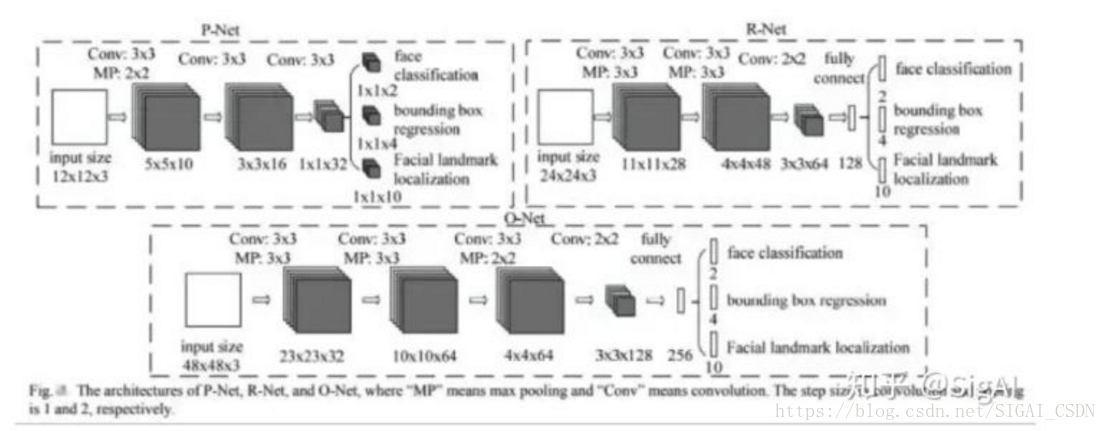 MTCNN[20]顾名思义是多任务的一个方法,它将人脸区域检测和人脸关键点检测放在了一起,同Cascade CNN一样也是基于cascade的框架,但是整体思路更加巧妙合理,MTCNN总体来说分为三个部分:PNet、RNet和ONet,如下图所示: