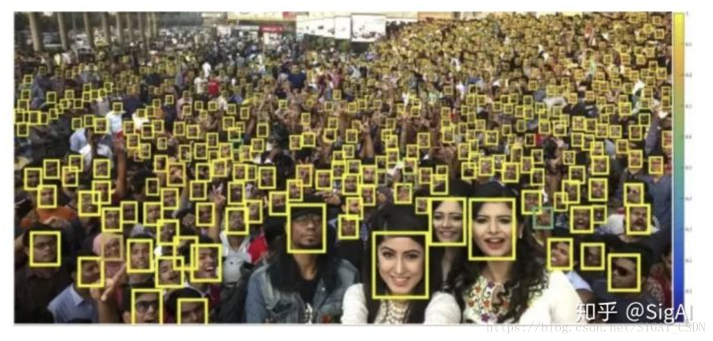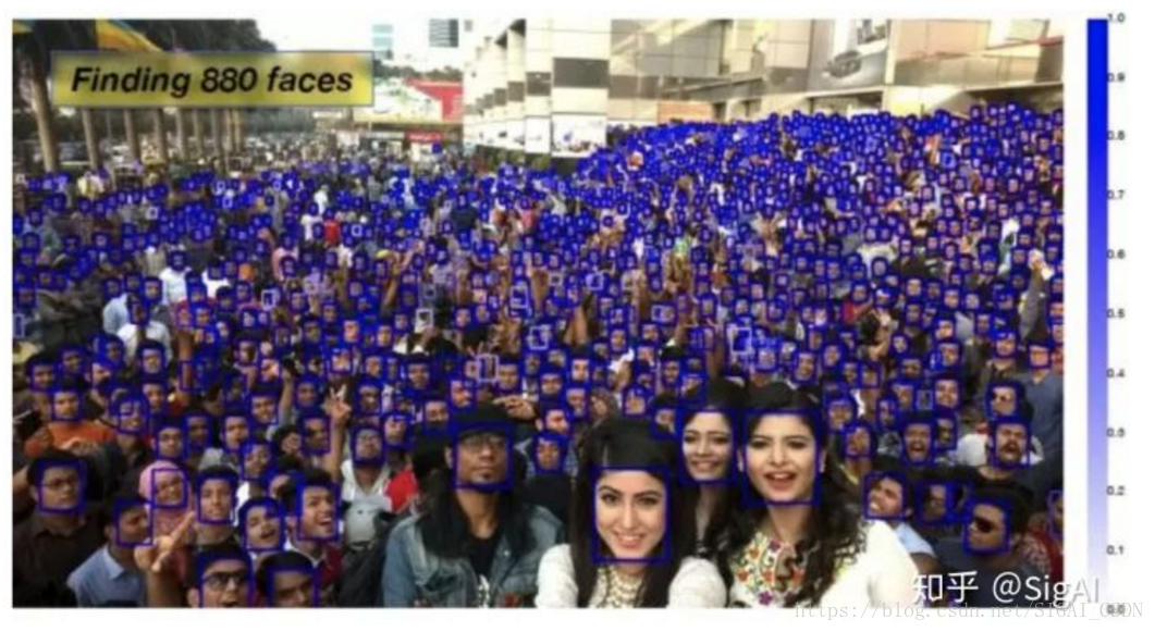 之前我们讲过的一些方法都没有针对小目标去分析,小目标检测依然是检测领域的一个难题,[21]本文作者提出的检测器通过利用尺度,分辨率和上下文多种信息融合来检测小目标,在上图的总共1000个人脸中成功检测到约800个,检测器的置信度由右侧的色标表示。