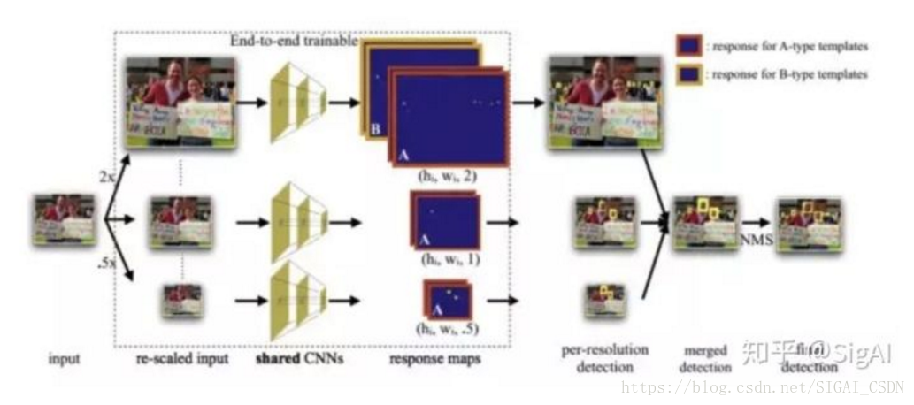 从输入图像开始,首先创建一个图像金字塔(2x插值)。然后我们将缩放的输入图像输入到CNN中,获得不同分辨率下人脸预测响应图(后续用于检测和回归)。最后将在不同尺度上得到的候选区域映射回原始分辨率图像上,应用非极大值抑制(NMS)来获得最终检测结果。