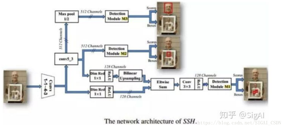 [23] SSH最大的特色就是尺度不相关性(scale-invariant),比如MTCNN这样的方法在预测的时候,是对不同尺度的图片分别进行预测,而SSH只需要处以一个尺度的图片就可以搞定。实现方式就是对VGG网络不同level的卷积层输出做了3个分支(M1,M2,M3),每个分支都使用类似的流程进行检测和分类,通过针对不同尺度特征图进行分析,变相的实现了多尺度的人脸检测。