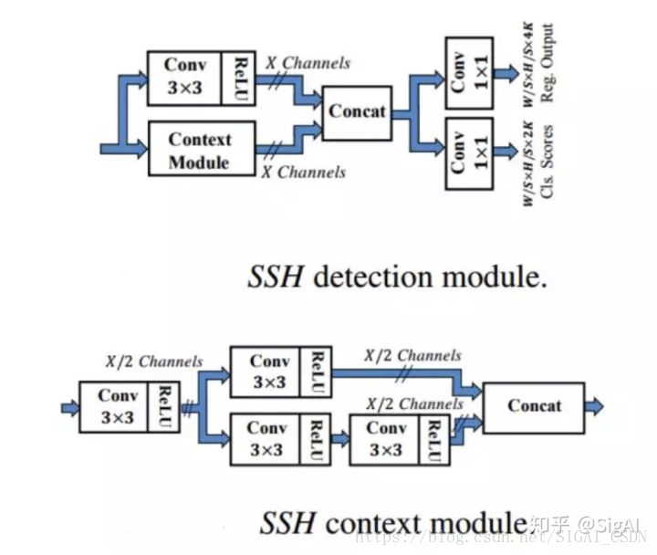 其中,M模块如上图所示,包含了分类和回归2个任务,其中Context Module的为了获得更多的上下文信息,更大的感受野,对该模块使用了等价的5*5和7*7的卷积分别进行操作,然后进行特征的concat最终形成了上图的Context Module。(由于大的卷积核效率问题,根据INCEPTION的思想,使用2个3*3的卷积核替代一个5*5的卷积核,使用3个3*3的卷积核替换1个7*7的卷积核)。