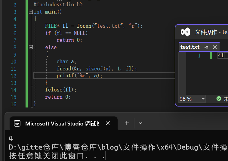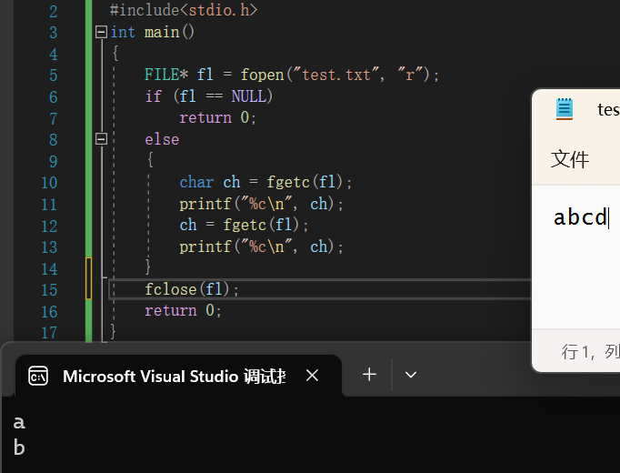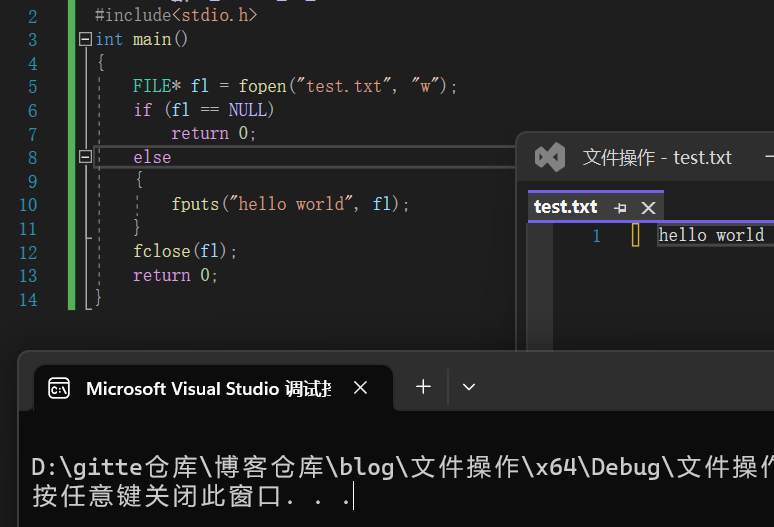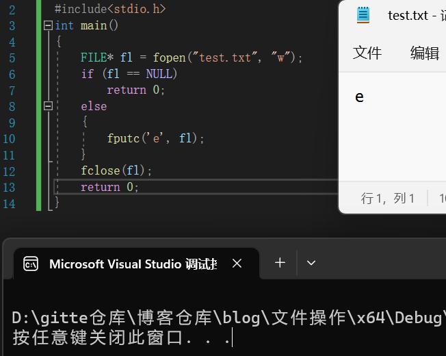 由于要输出数据,故文件打开方式为"w",此时如图将字符c输出到了文件内。