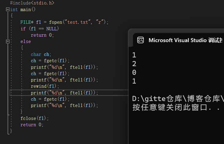 以"r"的方式打开文件,位置指针初始时在文首,偏移量为0,而每进行一次字符读写,偏移量便加一。 ftell函数能反映当前文件位置指针的位置。