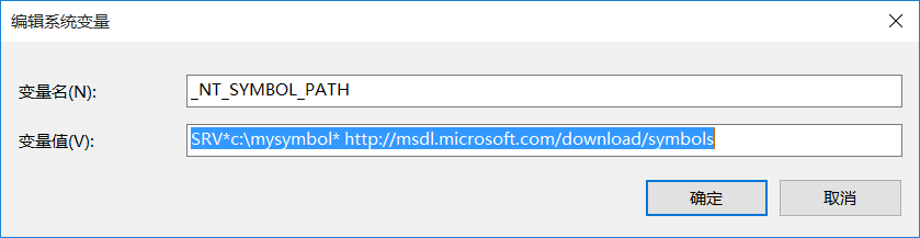 在系统变量中增加 _NT_SYMBOL_PATH,变量值为