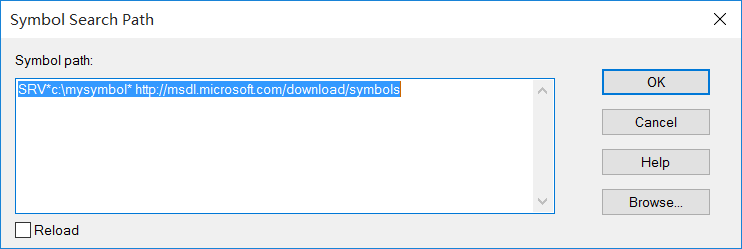在Symbol path编辑框中添加 SRV*c:\mysymbol* http://msdl.microsoft.com/download/symbols