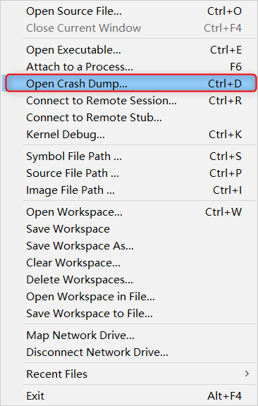 在菜单File\Open Crash Dump下打开dmp文件,或者直接拖动dmp文件到WinDbg对话框。