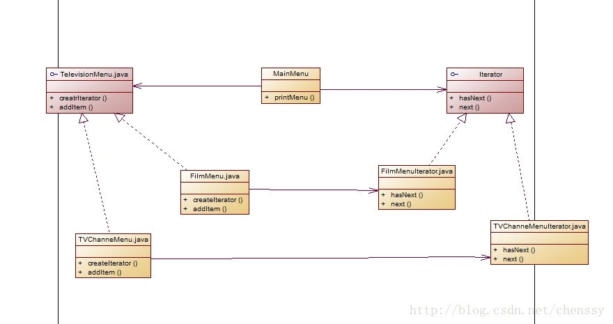 public class TVChanneMenu implements TelevisionMenu{List<MenuItem> menuItems;/*** 构造函数完成初始化*/public TVChanneMenu(){menuItems = new ArrayList<MenuItem>();addItem(1, "CCTV-1", "This is CCTV-1");addItem(2, "CCTV-2", "This is CCTV-2");addItem(3, "CCTV-3", "This is CCTV-3");addItem(4, "CCTV-4", "This is CCTV-4");addItem(5, "CCTV-5", "This is CCTV-5");}/*** @desc 将电视频道节目添加菜单集合中*/public void addItem(int channe,String name,String description){MenuItem tvMenuItem = new MenuItem(channe, name, description);menuItems.add(tvMenuItem);}public Iterator createIrerator() {return new TVChanneMenuIterator(menuItems);}
