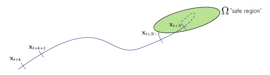 在公式1中, F ( x t + N ) F(x_{t+N}) F(xt+N)在闭环稳定中起到了至关重要的作用。它迫使系统状态在预测期结束时在一个特定的集合内取值,可以使用李亚普诺夫稳定性来分析、证明每次局部迭代的稳定性。例如对于一个监管问题( x t + k r e f = 0 f o r k = 0 , . . . , N − 1 x_{t+k}^{ref}=0 \quad for \quad k=0, ..., N-1 xt+kref=0fork=0,...,N−1),和一个“衰减”因子 ℓ \ell ℓ。上述优化问题的解使得系统在 x t = 0 x_t=0 xt=0, u t = 0 u_t=0 ut=0处稳定,也就意味着系统的终端约束 (terminal constraint)为 x t + k = 0 x_{t+k}=0 xt+k=0,如图1所示。然而,全局的稳定性是没有保证的。为此,必须考虑引入terminal cost和terminal constraint。 但是,仅添加terminal constraints可能不可行,而且一般添加约束的优化问题可能会很难解决。 在许多实际情况下,在控制设计过程中不强制执行terminal constraints,而是验证了后验(如果不满足的话,则可以增加预测范围)。
