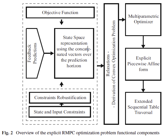 尽管MPC公式具有鲁棒性,但是存在存在鲁棒控制变量时需要进一步的鲁棒性保证。线性鲁棒模型预测控制(Robust Model Predictive Control, RMPC)问题可以表述为一个明确求解的极大极小优化问题。作为一个最优度量,我们可以选择最小峰值性能度量(MPPM)的已知鲁棒性。图2概述了相关的构建块。