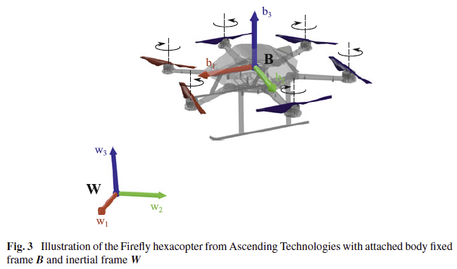 多旋翼系统的6DoF位姿可以通过固定惯性坐标系 W W W(世界坐标系)和机身坐标系 B B B来定义,如图3所示。我们用 p p p表示坐标系 W W W中坐标系 B B B的原点位置,用 R R R表示坐标系 W W W中坐标系 B B B的旋转矩阵。此外,我们用 φ φ φ、 θ θ θ和 ψ \psi ψ来表示飞行器的横摇、俯仰和偏航角。在该模型中,我们假设一个低级的姿态控制器能够跟踪期望的横摇和俯仰 φ d φ_d φd、 θ d θ_d θd角,并具有一阶行为。一阶内环近似为MPC提供了充分的信息来考虑低电平控制器的行为。通过经典的系统辨识技术,可以辨识出回路的一阶参数。用于多转子系统轨迹跟踪的非线性模型如式(37)所示。