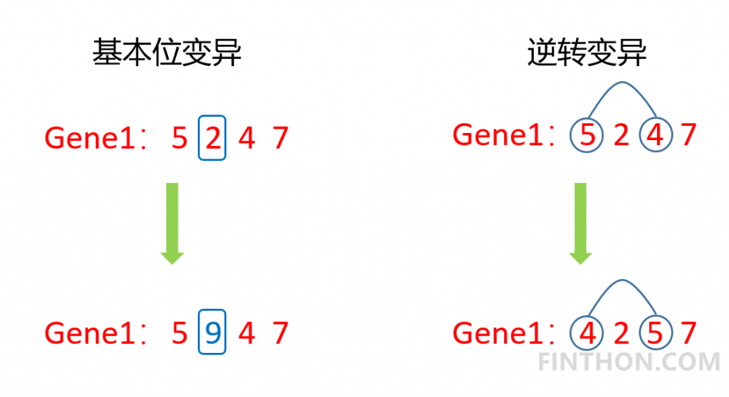 变异在遗传过程中属于小概率事件,但是在种群数量较小的情况下,只通过交叉操作并不能产生优秀的后代,此时变异就显得非常重要了。通过适当的变异甚至能够产生更优秀的后代。变异的方式有很多种,常规的变异有基本位变异和逆转变异。它的过程如下: