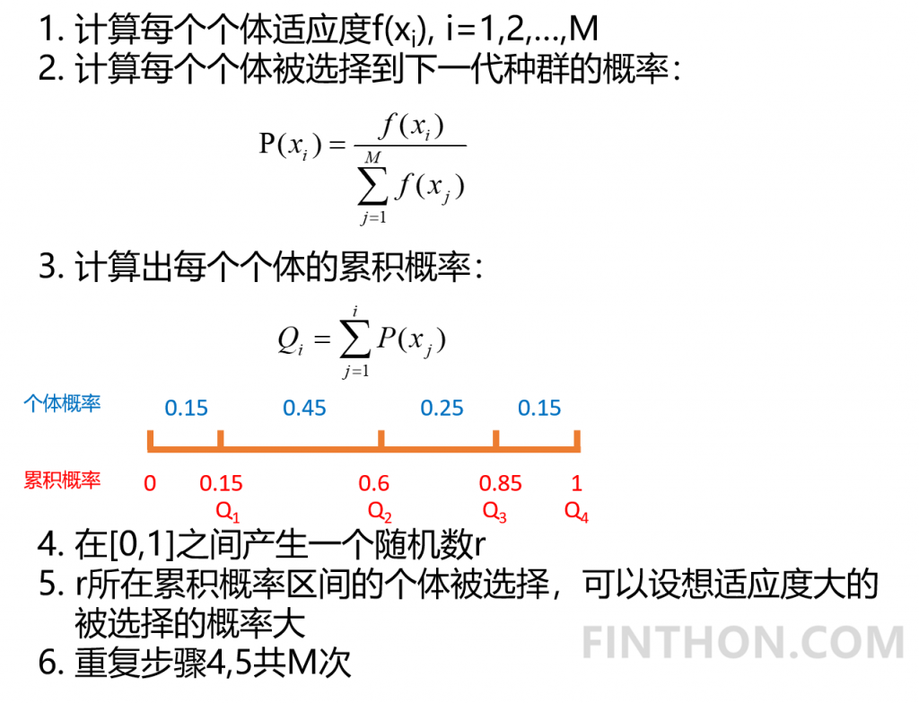 按照概率从上一代种群中选择个体,直至形成新的一代。我们需要适应度函数值大的个体被选择的概率大,可以使用轮盘赌选择法。该方法的步骤如下: