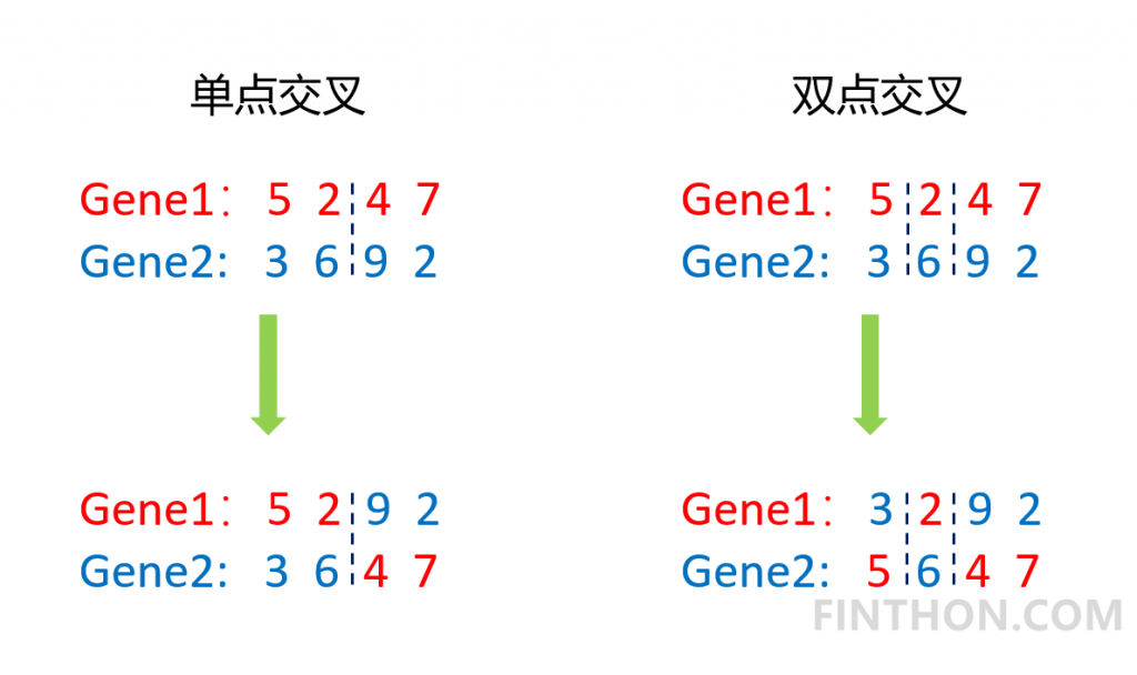 交叉是指将两个个体的基因片段在某一点或者某几点进行互换,常用的有单点交叉和双点交叉。它的过程如下: