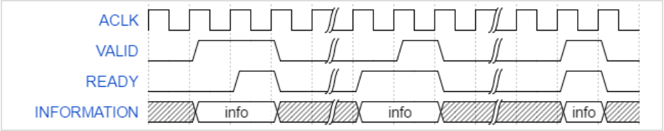 5个传输通道均使用VALID/READY信号对传输过程的地址、数据、控制信号进行握手。使用双向握手机制,传输仅仅发生在VALID、READY同时有效的时候。