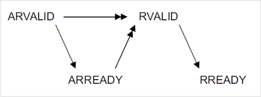 上图为读操作的依赖关系,ARREADY可以等待ARVALID信号,RVALID必须等待ARVALID和ARREADY同时有效后(一次地址传输发生)才能能有效;