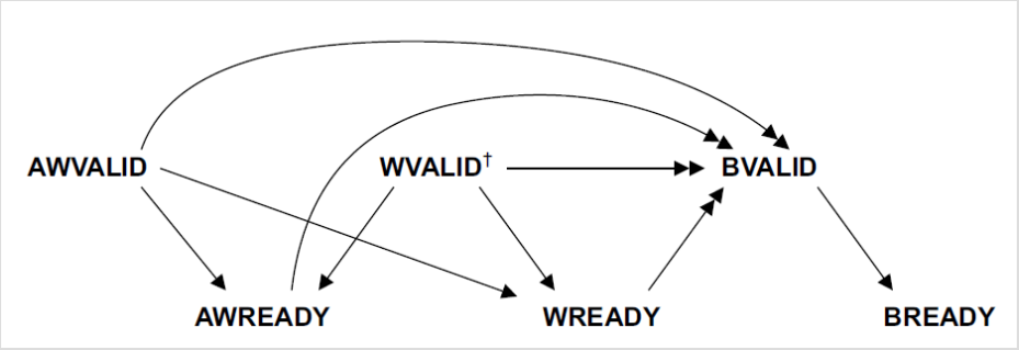 在AXI4中,定义了额外的依赖关系,即BVALID必须依赖AWVALID、AWREADY、WVALID和WREADY信号;