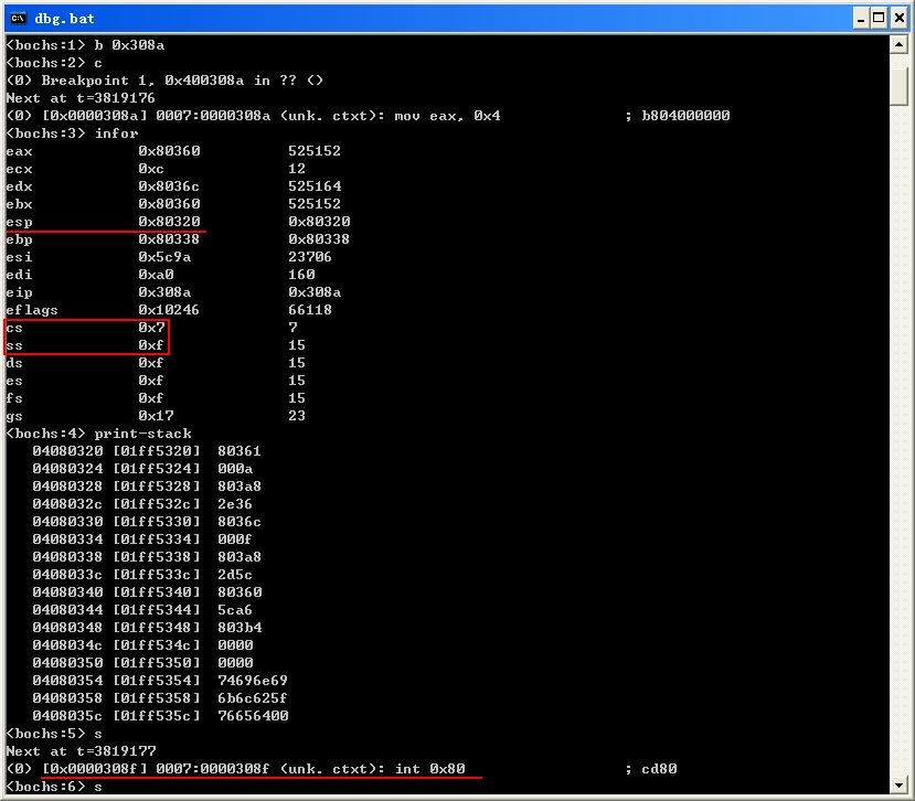 可以看到,指令mov eax, 0x4对应的cs为0x7,eip为0x308a,ss为0xf,esp为0x80320