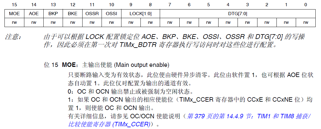 该寄存器,我们只需要关注最高位: MOE 位,要想高级定时器的 PWM 正常输出,则必须设置 MOE 位为 1,否则不会有输出。注意:通用定时器不需要配置这个。