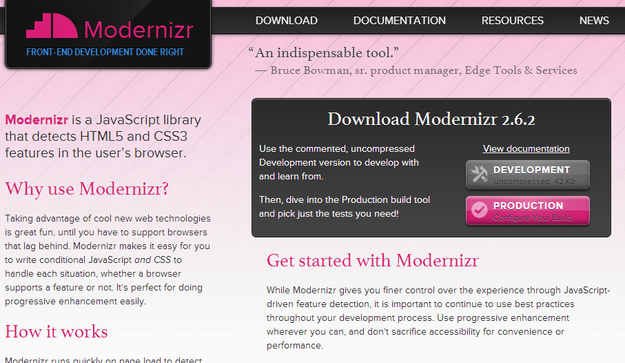 它是一个很棒的JS类库,可以通过检测浏览器特征实现渐进增强,你可以通过CSS或者JS判断处理。当然,第一步你得下载、安装它,下面演示如何安装。