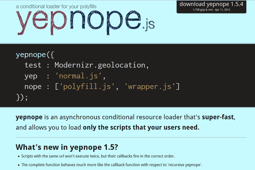 Yepnope是一个异步的条件资源加载器,允许用户仅仅记载需要的脚本,速度超快。你可以在项目页面实现自定义下载。