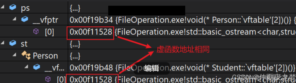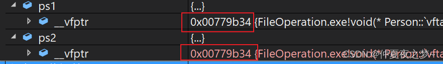 通过监视窗口就会发现,同一个类的对象的虚表指针是相同的。其实上面也提到,虚表指针 __vfptr本质上是 某一句汇编指令的地址,不同类的对象因为要调用不同的虚函数,所以执行的指令肯定是不同的,但是同一个对象调用的虚函数是一样的,所以执行相同的指令,即虚表指针是一样的。