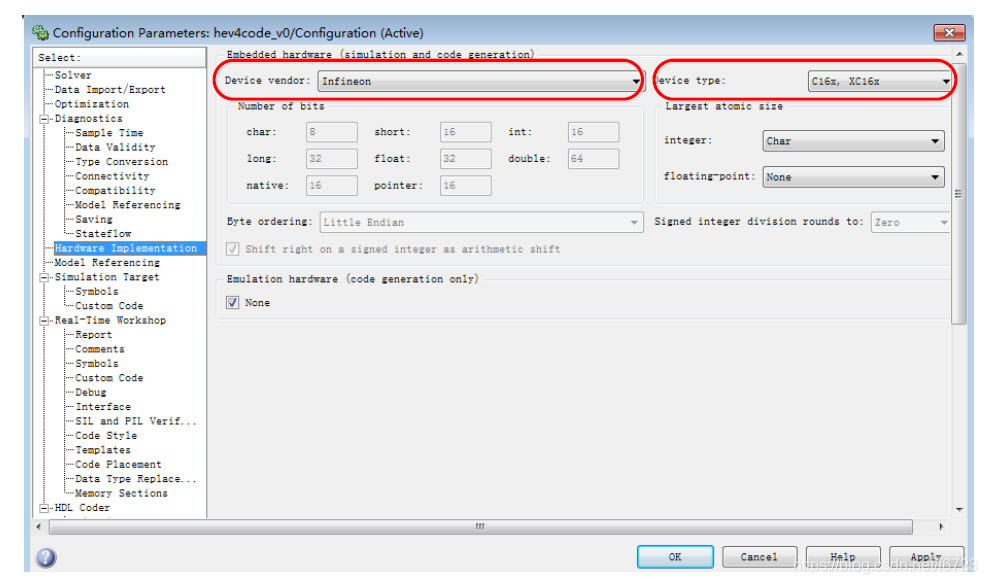 (3) 点击对话框的Hardware Implementation面板,可设置硬件属性。 在Device vender选择Infineon,在Device type处选择设备类型C16x,XC16x(此处以Infineon C166 系列为例),其他选项为默认值,如图所示。