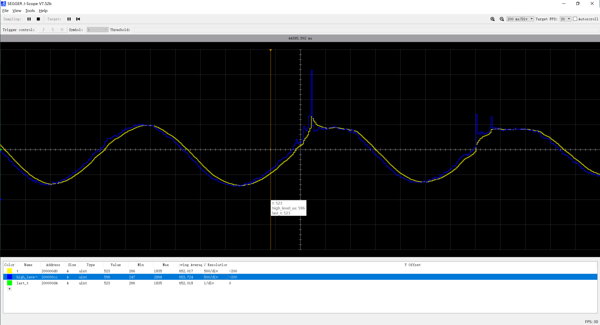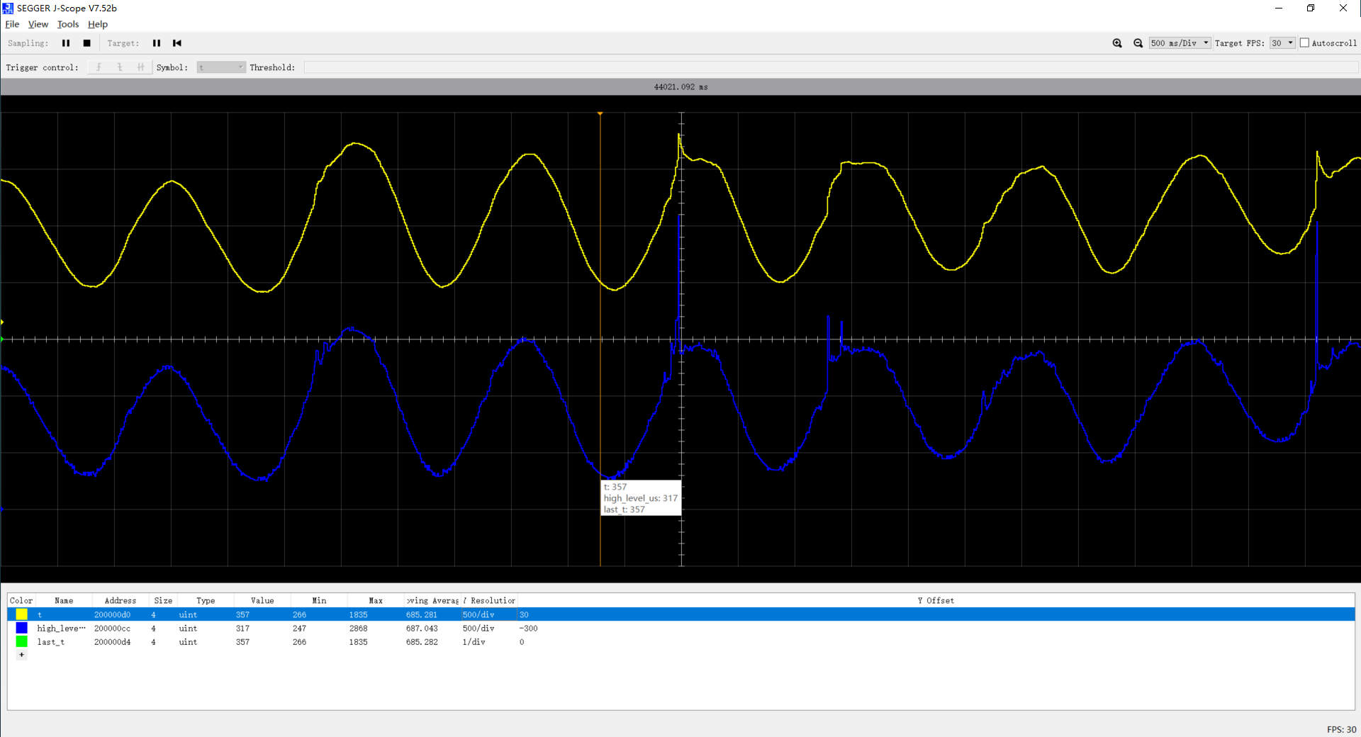 超声测距模块,用stm32定时器捕获实现测距,滤波器的参数调了一个大概,α=0.2,获取到的高电平时间jscope波形图如下: