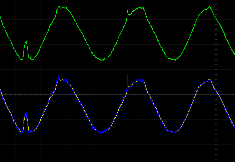 蓝线----滤波前输入;黄线----滤波后输出;绿线----上次输出