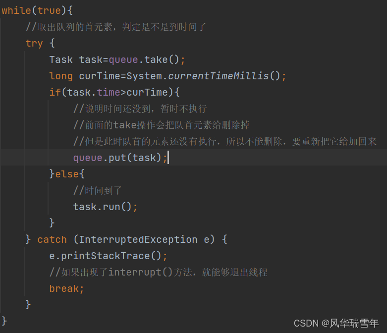 import java.util.concurrent.PriorityBlockingQueue;public class ThreadDemo26 {//使用这类来描述任务static class Task implements Comparable<Task>{//command表示这个任务是啥private Runnable command;//time表示这个任务什么时候到时间//这里的time使用毫秒级的时间戳private long time;//约定参数time是一个时间差(类似与3000ms)//希望this.time来保存一个绝对的时间(毫秒级时间戳)public Task(Runnable command, long time) {this.command = command;//System.currentTimeMillis()表示当前的时间,再加上time表示这个任务要执行的时间this.time = System.currentTimeMillis()+time;}public void run(){command.run();}@Overridepublic int compareTo(Task o) {return (int)(this.time-o.time);}}//写这个内部类是避免和标准库中的Timer冲突static class Timer{//使用这个带优先级版本的阻塞队列来组织任务private PriorityBlockingQueue<Task> queue=new PriorityBlockingQueue<>();//使用locker对象来解决忙等问题private Object locker=new Object();public void schedule(Runnable command,long delay){Task task=new Task(command,delay);queue.put(task);//每次插入新的任务都要唤醒扫描线程//让扫描线程能够重新计算wait的时间//保证新的任务不会错过synchronized (locker){locker.notify();}}public Timer(){//创建一个扫描线程,这个线程用来判定当前的任务是不是已经到时间了Thread t=new Thread(){@Overridepublic void run() {while(true){//取出队列的首元素,判定是不是到时间了try {Task task=queue.take();long curTime=System.currentTimeMillis();if(task.time>curTime){//说明时间还没到,暂时不执行//前面的take操作会把队首元素给删除掉//但是此时队首的元素还没有执行,所以不能删除,要重新把它给加回来queue.put(task);//进行等待synchronized (locker){locker.wait(task.time-curTime);}}else{//时间到了task.run();}} catch (InterruptedException e) {e.printStackTrace();//如果出现了interrupt()方法,就能够退出线程break;}}}};t.start();}public static void main(String[] args) {System.out.println("程序启动");Timer timer=new Timer();timer.schedule(new Runnable() {@Overridepublic void run() {System.out.println("hello");}},3000);}}
