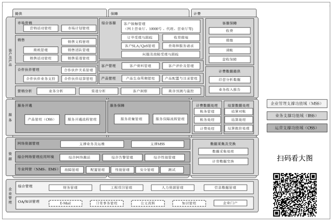 争论的问题未必是“非黑即白”的选择题,事物往往具有复杂性,通过不同维度和层次的抽离,可以看见不同层次的本源。比如 CTG-MBOSS 功能架构就对电信业务领域做了客户产品、服务、资源、企业管理的划分,又基于提供、保障、计费这个 层次做了划分,如图 2.10 所示。