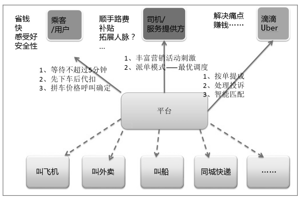 有意思的事情发生了,Uber 老板一觉醒来发现他创造的不仅仅是一家出行公司,如图 2.9 所示。司机和车只是平台的资源,供应方(Supply)可以是一家蛋糕店、鲜花店或者是西湖 的休闲船只管理中心,那么面向不同的供应方,该平台架构的哪些能力是可以复用的呢? 如下: