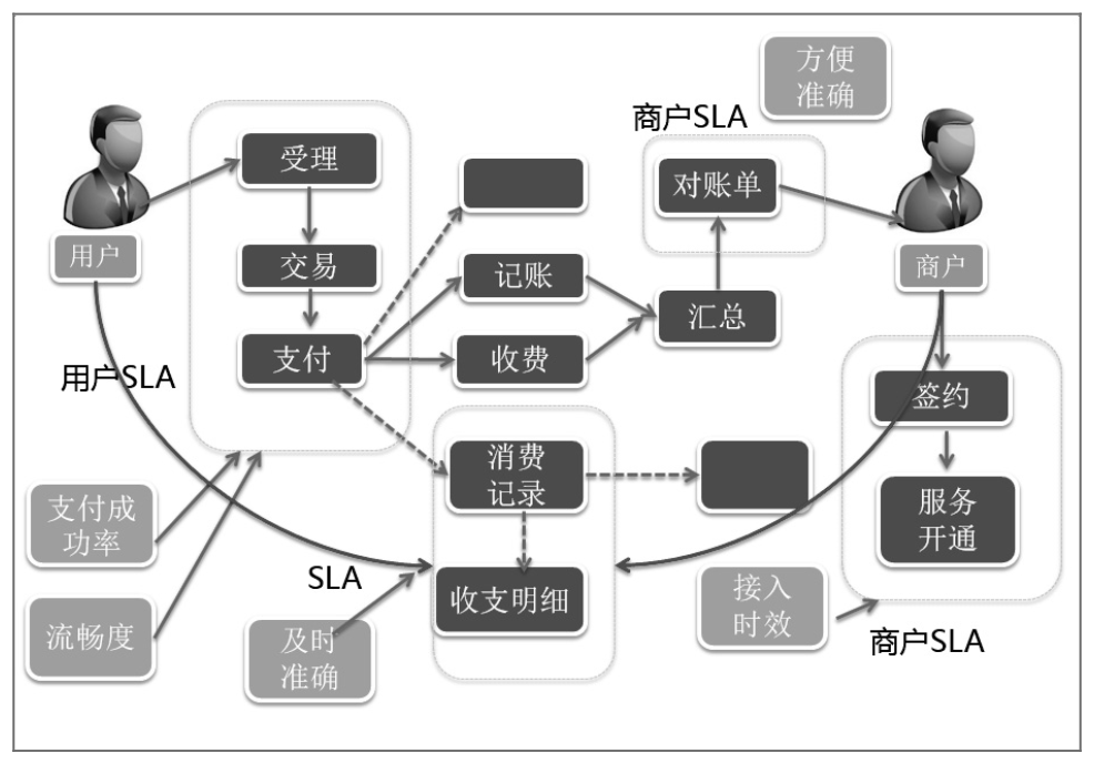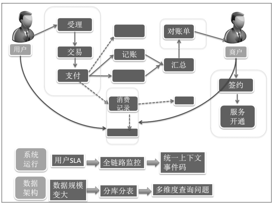讲了 12306,再来看一个例子。以图 2.13 所示的第三方支付为例(仅作示意,切莫细究图示模块内容的完备性)。业务运行(支付业务)涉及用户下单、形成交易并支付等相关处理,而用户非常关注能不能快速、正确且安全地进行支付。为了求证付款正确性,他们也会习惯性地在第一时间查询消费记录。对于商户而言,他们也有查询收支明细的诉求。到这里,可能有人会问,了解 SLA 要求和具体的架构设计存在哪些关联呢?