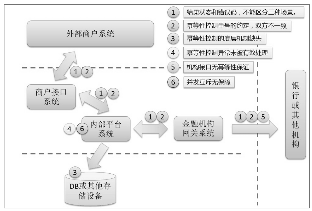 笔者有一个观点,就是要从全局视图来看问题,拘泥于细节上的问题会出现“一叶障目不见泰山”的情况。在软件的设计模式里有一个拦截器模式,在软件思想里有面向切面的设计,比如著名开源软件 Spring 的 AOP 思想。面向切面也是架构设计的一个分析思路, 比如可以分析稳定性及性能,包括对应系统特有的资金安全等。如图 2.16 所示,一个支付系统外部连接商户系统,中间做支付处理,后台与银行或其他支付机构进行通信。那么在幂等性、接口的结果状态和错误码约定方面都要做相应的处理。