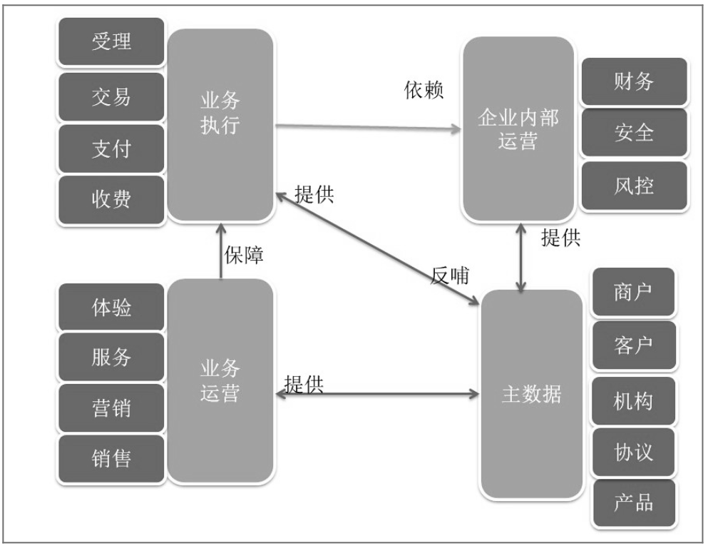 根据企业运营业务的经验,可以抽象出一种典型的组织形式: 业务执行、业务运营、企业内部运营和主数据,如图 2.12 所示。业务执行、业务运营等视角又可以加以组合,组合可以用来考量设计的要素(谁为谁服务)。比如营销是业务运营的板块,是为了更好地执行业务。Uber 的打折优惠也好,免费拼车也好,都是不影响主流程的,是可以进一步刺激消费的设计; 然而,有的产品把营销活动设计得极其生硬,极其难用,相当于把一件大人的衣服穿到了一个小朋友身上。或许可以有这样一种设计,可以对产品的流量进行分析,当检测到某项指标达到某一阈值时,便强烈预警产品应该优化,并能通过分析给出优化建议。可能一开始数据不够准确,但是通过不断训练和尝试,可以形成正循环。