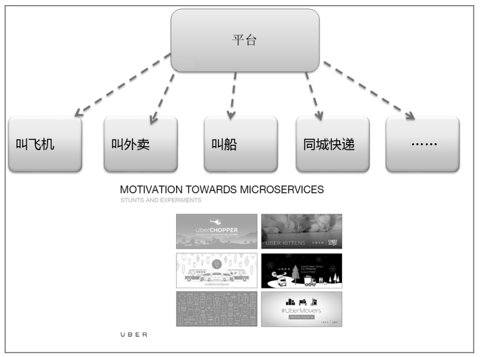 抽象、扩展人人都知道,但是如何识别本质而不做 BDUF(Big Design Up Front)则并不容易。以 Uber 为例,Uber 的定位已经不仅仅是一家出行公司,而是一家可以利用其物流能力叫飞机、叫外卖,包括送花的公司,如图 2.15 所示。要知道 Uber 也不是一天炼成的。有文章披露,旧系统是为专用客车运输所设计的,其中做了很多假设:每辆车一个乘客,不适用 Uber Pool(拼车服务)。将运送人的想法深深嵌入数据模型和接口里,会限制将该架构扩展到新的市场和产品上,比如运送食物和箱子。最初的版本是按城市来划分的。这样做对于可扩展性而言是好的,每个城市可以独自运营。但当越来越多的城市加入的时候,这就变得越来越难以管理。城市有大有小,负载也不一样。后来,他们重构了 dispatch 模块,让调度的接口不依赖具体的专用客车领域而具备可扩展性,并通过微服务来做切分和管理。