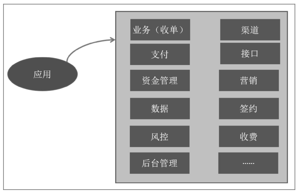 有同学可能会问,多个视角有什么用呢?图 2.10 从颜色区分了业务支撑、运营支撑、 企业管理等。不难理解,业务支撑直接面向用户前端,而运营支撑是支持业务支撑的,比如产品管理、网络资源管理。运营支撑能力直接影响到前端业务的效率、体验和 SLA。以一个第三方支付的应用为例。单就这样一个应用来说就有诸多的考量因素,比如风控、营销、签约(签约的顺畅度)等,如图 2.11 所示。