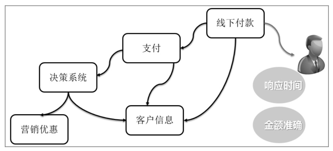 笔者在如何做架构设计这部分旗帜鲜明地提出: 以终为始,不忘初心。初心是什么, 就是用户的本质需求。如图 2.7 所示,不论系统如何组织,用户最关心的是响应时间 (Response Time,RT),以及展示的金额是否准确。所以,在一开始设计时就要考虑如何获 取到用户关注的两个要素——体验和准确性。是否要考虑链路级的监控,以及链路级的关 键数据校验;如果规则分散到多个系统,如何检查整体组合的命中等情况;链路上每个系统的容量和响应时间是多少;等等。以上这些都在考虑之列。