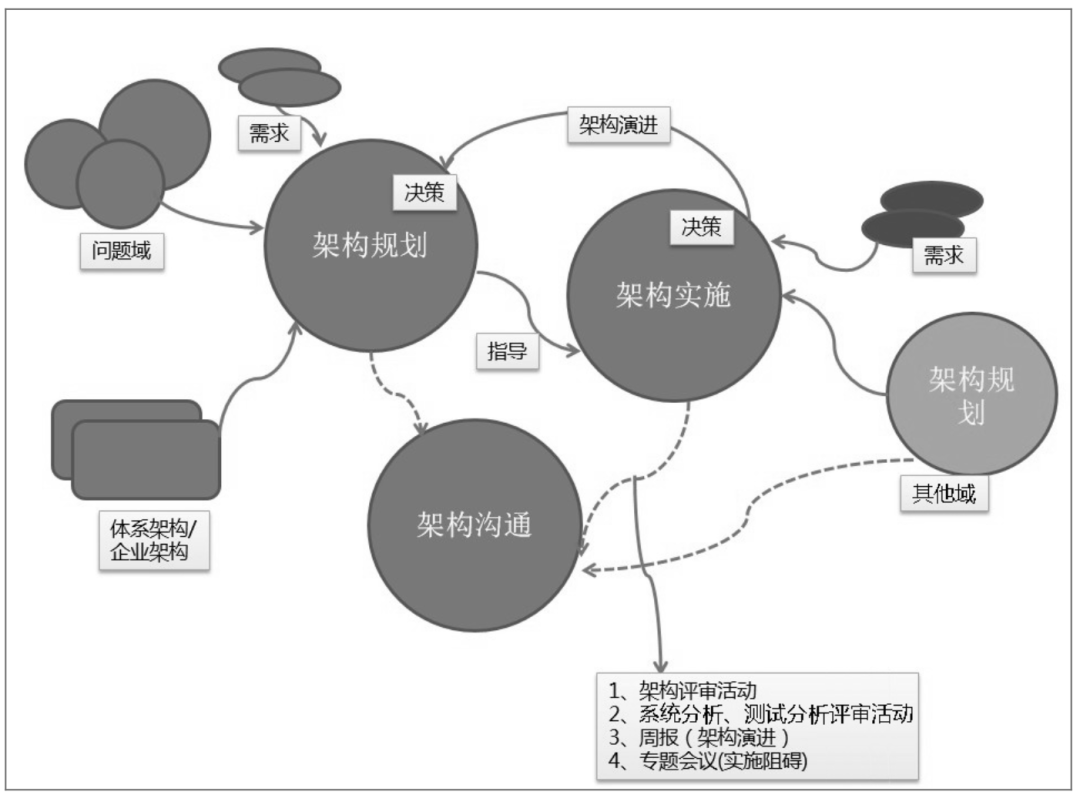 图 2.17 是一个大公司架构生命周期的活动图。从架构规划到架构实施,其中有不断的架构沟通。而架构实施的反馈又将纳入下一代的架构规划中。下一代架构规划,一方面要纳入现阶段的问题,另一方面要基于行业领域知识、同行参考和商业洞察进行。2011 年,我们做过一个不太成功的示范,在产品层之下设计了一个基础层,做核心领域的沉淀,后来孵化出了 10 多个小产品,结果核心的两张表被过度抽象,但这对于不确定性很强的业务是不合适的。完全烟囱模型+插件(或工具黏合剂)的方式可能更合适。