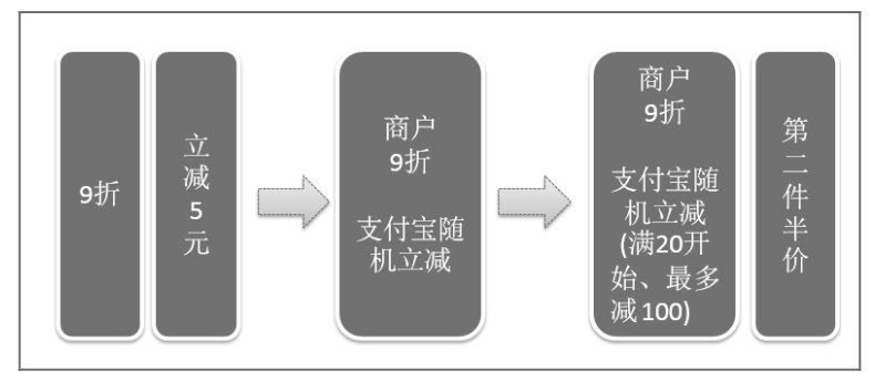 一艘民用的船只如果发展成一艘巨舰,在安全性、载重、动力设备、船只内部设计等各方面都有差异。而对于时下很火热的线下 O2O 业务,广大群众乐于比较价格,计算各种优惠,厂商也乐此不疲地发展营销创新,从街头的跳楼价到打折,不一而足。如图 2.6 所示的例子,起初的优惠方式为:打折、立减。转换为规则的表达就是 X*折扣比例及 X−Y(折扣金额)。演变到第二阶段时,优惠方式增加了累计,就是打折和立减同时生效。演变到第三阶段便出现了有条件的累计优惠,阶梯性优惠,指定品种/数量优惠等情况。从三个阶段的可扩展性层面来设计优惠规则,其实并不简单,因为后期的需求与起初相比已经有很大的不同。