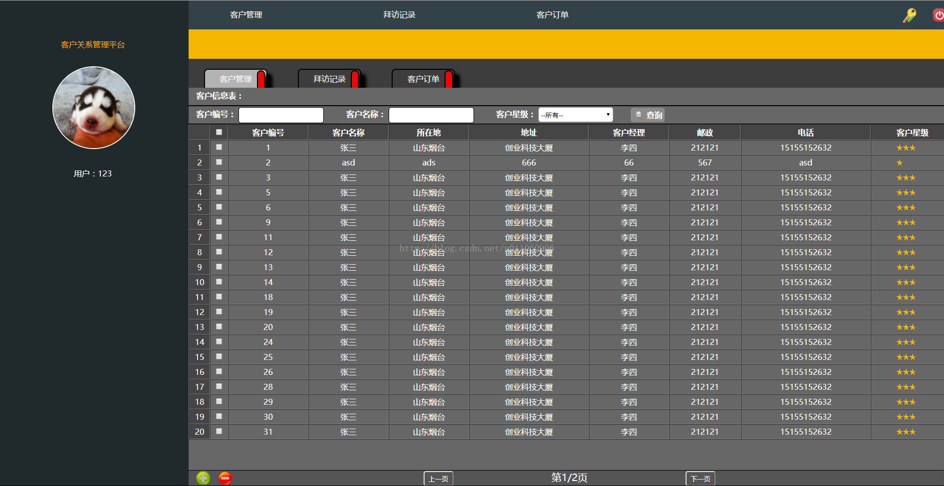 <div class="container" id="container"><div class="left"><div class="t"><div>客户关系管理平台</div><img src="img/photo.jpg" alt="图片加载失败!" width="70%" class="uimg"/><div class="us"></div></div></div><div class="right"><div class="top"><div class="lie" onclick="getPage(1)">客户管理</div><div class="lie" onclick="getPage(2)">拜访记录</div><div class="lie" onclick="getPage(3)">客户订单</div><img src="img/quit.png" alt="" onclick="quit()"/><img src="img/password.png" alt="" onclick="changeSate('changePassword')"/></div><div class="toolbar"></div><div class="tableBar"><div class="lieTable" id="customer"><span onclick="changePage(this)">客户管理 </span><div class="exit" onclick="exit(this)"></div></div><div class="lieTable" id="record" style="display: none"><span onclick="changePage(this)">拜访记录</span><div class="exit" onclick="exit(this)"></div></div><div class="lieTable" id="order" style="display: none"><span onclick="changePage(this)">客户订单</span><div class="exit" onclick="exit(this)"></div></div></div><div class="content"><iframe class="page" src="homePage_1.html" frameborder="0"></iframe><!--<img src="img/none-box.png" alt="图片加载失败!"/>--></div></div><div class="changePassword" id="changePassword" style="display:none;" ><div class="top" id="changePasswordTop"><div class="close" onclick="changeSate('changePassword')"></div></div><div class="cont"><form action=""><table width="80%"><tr><td><span>原密码</span></td><td><input type="text" id="oPw"/></td></tr><tr><td><span>新密码</span></td><td><input type="text" id="nPw"/></td></tr><tr><td><span>确认密码</span></td><td><input type="text" id="qPw"/></td></tr><tr><td><input class="set" type="reset"/></td><td><input class="set" type="reset" value="确定" onclick="changeThePassWord()"/></td></tr></table></form></div></div></div>