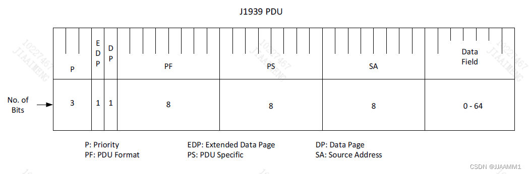一些CAN数据帧字段被有意排除在J1939 PDU定义之外,因为它们完全由ISO 11898-1定义和控制,并且对于数据链路层之上的所有OSI层都是不可见的。以这种方式控制的字段包括SOF、SRR、IDE、RTR、FDF、r0、CRC、ACK和EOF字段。七个PDU字段如图1所示。